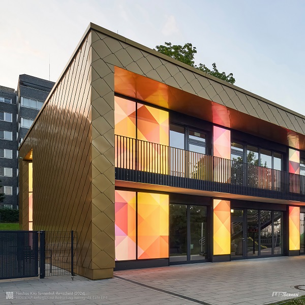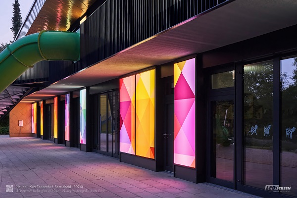 Die Evangelische Stiftung Tannenhof hat in Remscheid eine neue, zusätzliche Kindertagesstätte errichtet – ein Bauwerk, das nicht nur funktional und kindgerecht ist, sondern durch seine Gestaltung besonders auffällt. Mit einer goldfarbenen Fassade und vor allem farbigen LED‑Lichtpaneelen wird aus dem neuen Gebäude ein echtes Highlight. Die LED-Fassade stammt von Kuzman Invision – dekorativ, innovativ und ein echter Blickfang.